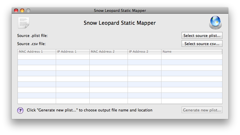 This application was written to be a Snow Leopard compatible replacement for Scott Finney's "Leopard Static Map Importer". The functionality is the same with the only difference being the exported plist is able to be imported into a Snow Leopard server. The code base is my own. Scott had nothing to do with this project nor does this imply any endorsement from Scott as a replacement for his application.
